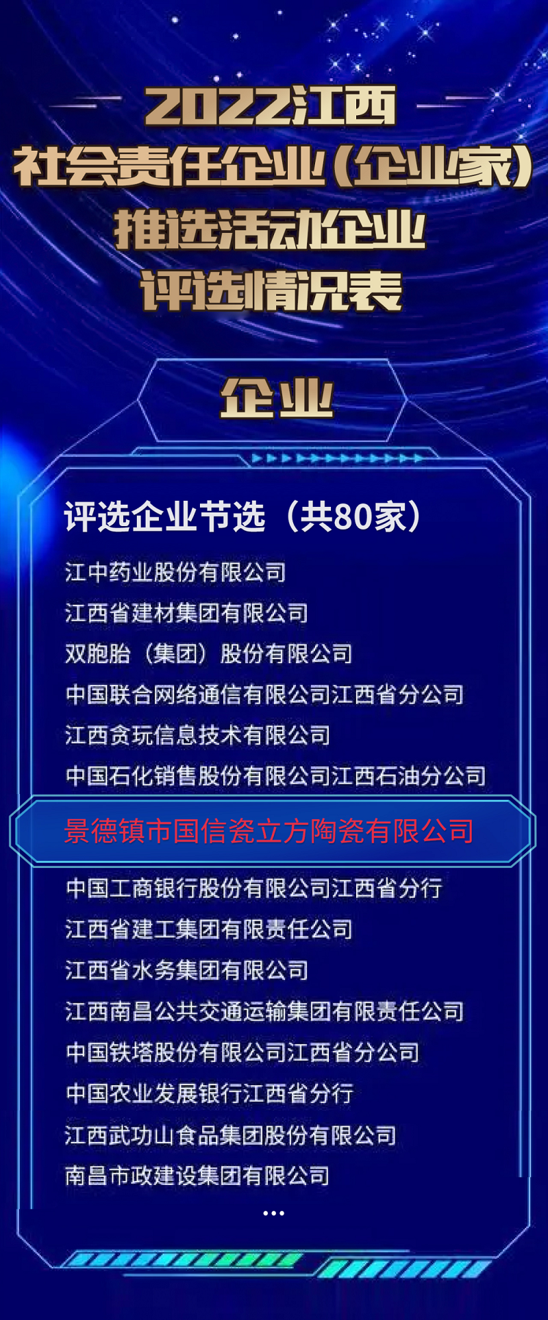 6月2日,由江西日報社(江西報業(yè)傳媒集團)、省農(nóng)業(yè)農(nóng)村廳、省國有資產(chǎn)監(jiān)督管理委員會、省地方金融監(jiān)督管理局共同主辦的“義利天下·2022江西社會責(zé)任企業(yè)(企業(yè)家)”推選活動正式揭曉,景德鎮(zhèn)市國控集團旗下國信瓷立方陶瓷有限公司從全省480家企業(yè)中脫穎而出,成為景德鎮(zhèn)市唯一入選企業(yè)。