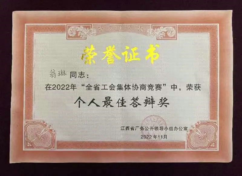 1月13日,全省工會(huì)集體協(xié)商競賽在贛州市舉行。通過激烈而有序的交鋒,景德鎮(zhèn)市總工會(huì)代表隊(duì)榮獲二等獎(jiǎng)!來自國控集團(tuán)的翁琳獲“最佳答辨獎(jiǎng)”。