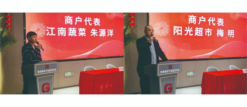 商戶代表江南蔬菜總經(jīng)理朱源洋、陽光超市董事長(zhǎng)梅明發(fā)表了講話。
