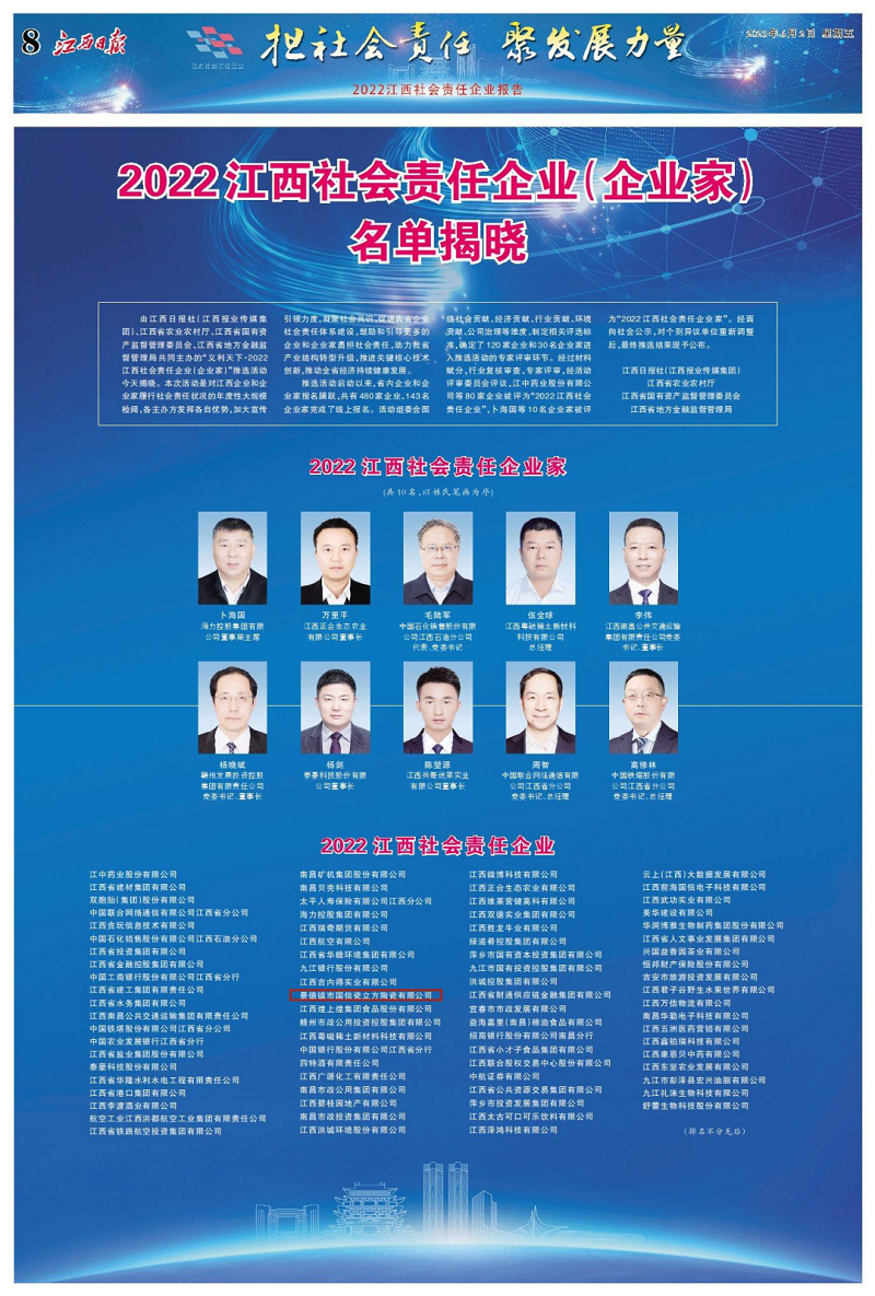 6月2日,由江西日報社(江西報業(yè)傳媒集團)、省農(nóng)業(yè)農(nóng)村廳、省國有資產(chǎn)監(jiān)督管理委員會、省地方金融監(jiān)督管理局共同主辦的“義利天下·2022江西社會責(zé)任企業(yè)(企業(yè)家)”推選活動正式揭曉,景德鎮(zhèn)市國控集團旗下國信瓷立方陶瓷有限公司從全省480家企業(yè)中脫穎而出,成為景德鎮(zhèn)市唯一入選企業(yè)。