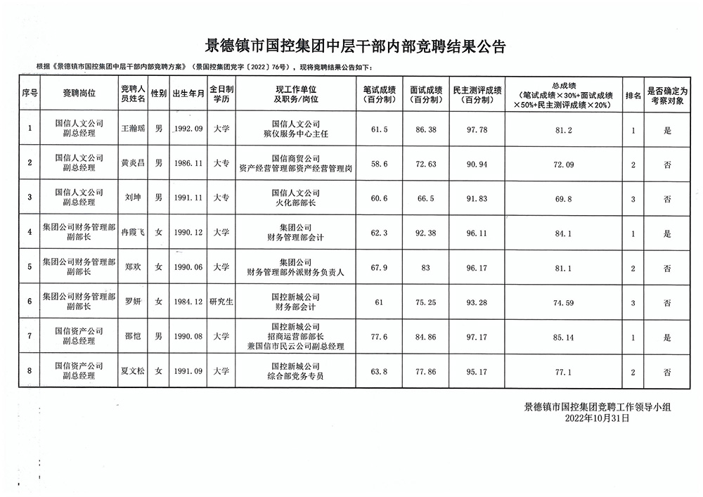 2022年景德鎮(zhèn)市國控集團中層干部競聘結(jié)果公告